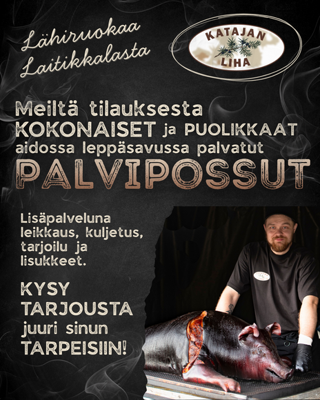 Palvaamme palvipossuja tilauksesta, niin kokonaisena kuin puolikkaanakin. Lisäpalveluna tarpeesi mukaan leikkaus, kuljetus, tarjoilu ja lisukkeet.